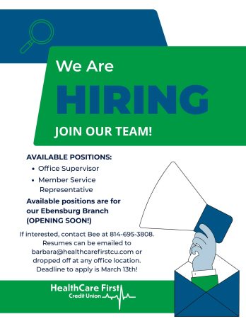 Applications and proof of income can be submitted at any office, emailed to loans@healthcarefirstcu.com or faxed to Johnstown (814) 535-5196 or Altoona (814) 695-6928.